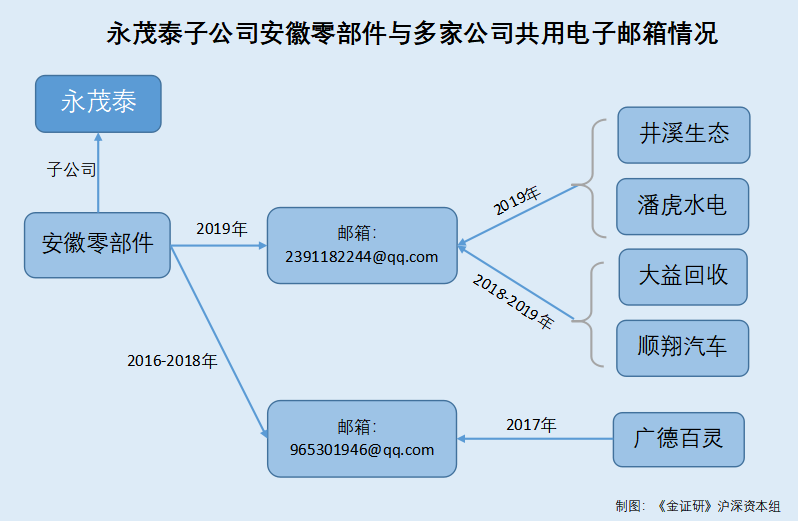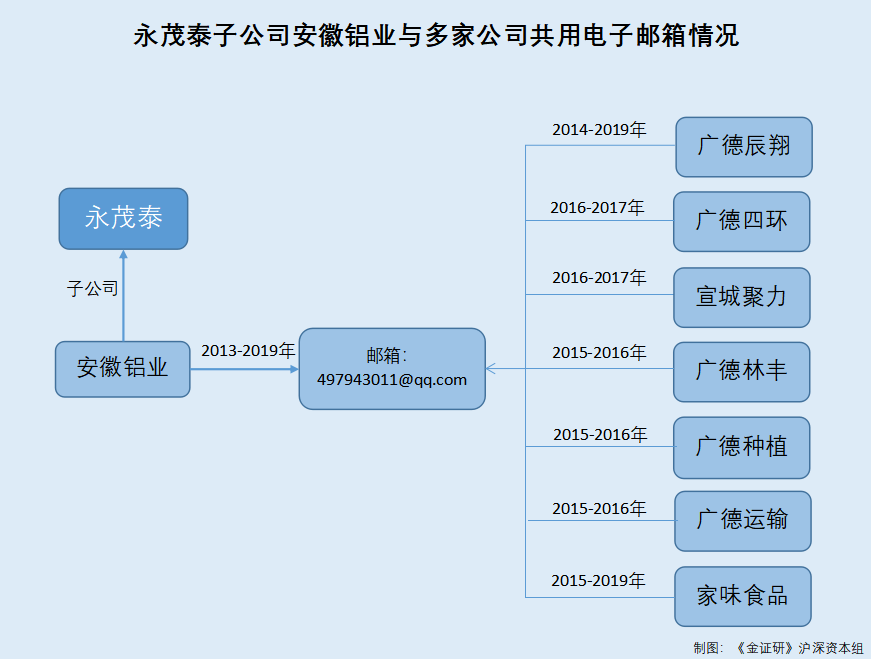 由此可见,永茂泰的子公司安徽铝业在2013-2019年间使用的电子邮箱,曾与6家公司、1家合作社一致。而根据《金证研》沪深资本组统计分析,并未发现安徽铝业在股权投资、相关人员任职上与上述公司及合作社存在关联。