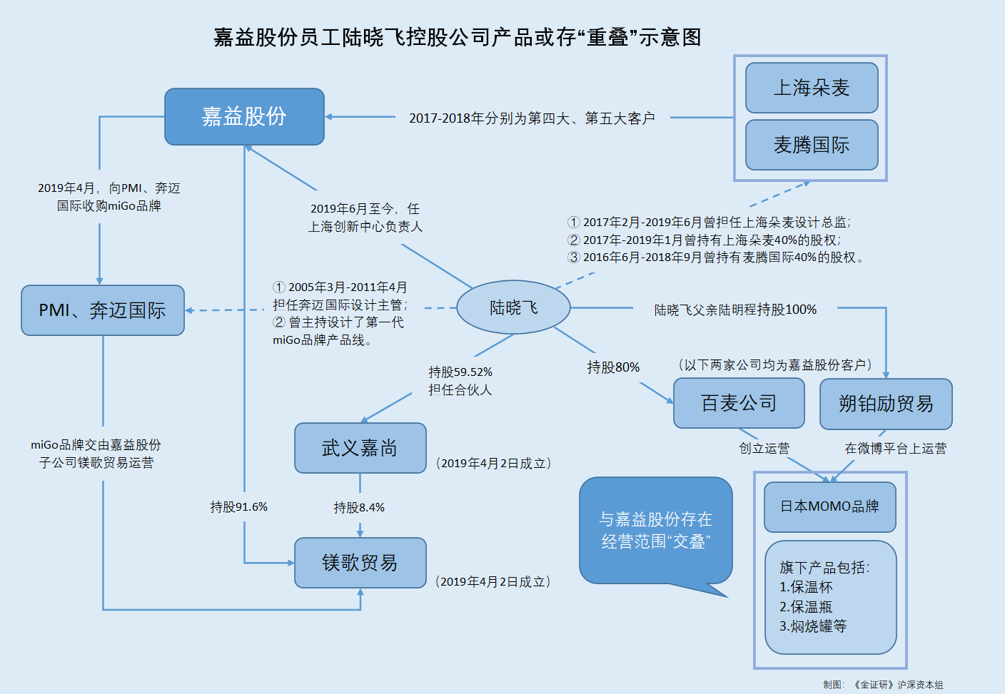 这意味着,来自大客户上海朵麦、曾经主持miGo品牌的陆晓飞,入职嘉益股份当年,嘉益股份与上海朵麦合作便终止,这其中是否过于“巧合”?且嘉益股份称其收购miGo品牌,是为加大对自有品牌的拓展力度,解释是否合理?此外,陆晓飞控股公司百麦公司经营的MOMO品牌,也销售保温杯、焖烧罐等产品,与嘉益股份产品或存“重叠”,嘉益股份独立性几何?不得而知。