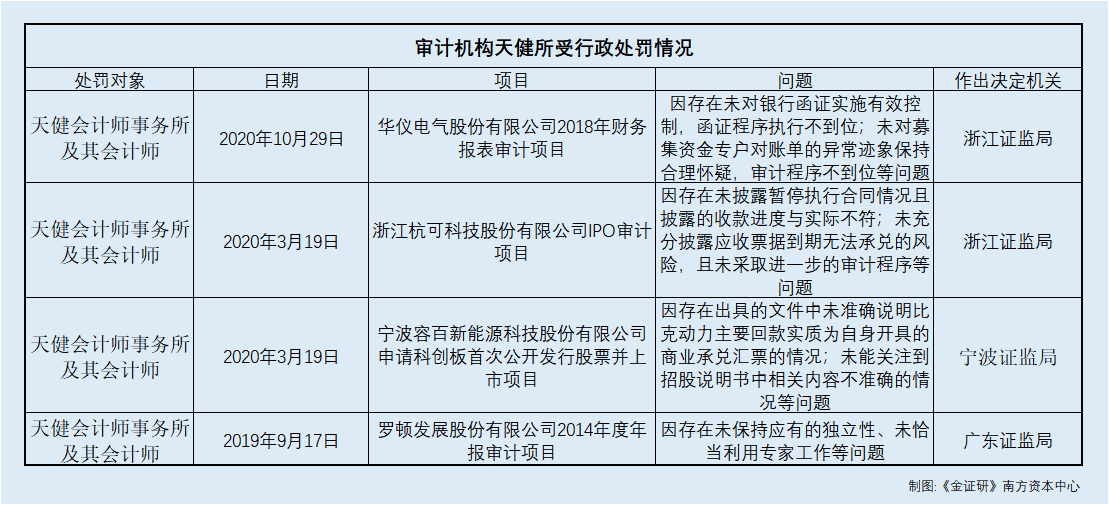 据浙江证监局数据,2020年10月29日,天健所及其会计师在执行华仪电气股份有限公司2018年财务报表审计项目中,因存在未对银行函证实施有效控制,函证程序执行不到位;未对募集资金专户对账单的异常迹象保持合理怀疑,审计程序不到位等问题,被采取出具警示函的监督管理措施,并记入证券期货市场诚信档案。