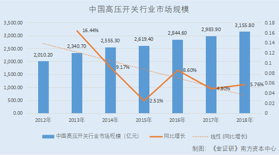 据招股书援引自前瞻产业研究院数据,2012-2018年,中国高压开关行业市场规模分别为2,010.2亿元、2,340.7亿元、2,555.3亿元、2,619.4亿元、2,844.6亿元、2,983.9亿元、3,155.8亿元。2013-2018年,中国高压开关行业市场规模分别同比增长16.44%、9.17%、2.51%、8.6%、4.9%、5.76%。