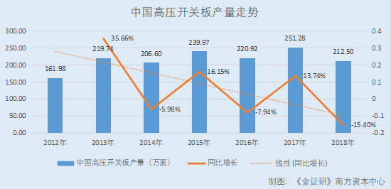 然而,江南奕帆下游高压开关行业,2012年以来市场规模增速呈放缓趋势。且2018年高压开关板产量现“负增长”,规模以上企业数量回落。