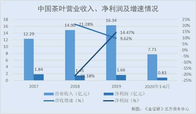根据《金证研》北方资本中心统计分析,2018-2019年,中国茶叶的营业收入增速分别为21.28%、9.62%,中国茶叶净利润增速分别为-21.18%、14.47%。