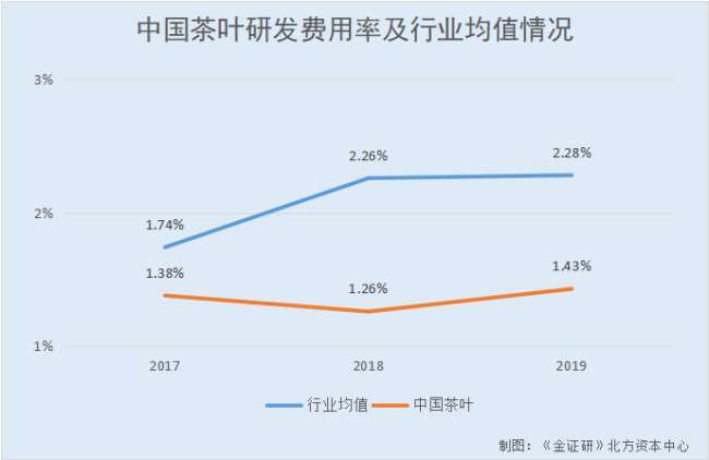 对比同行业可比公司,2018年年报及2019年年年报,中国茶叶研发费用率持续低于行业均值。