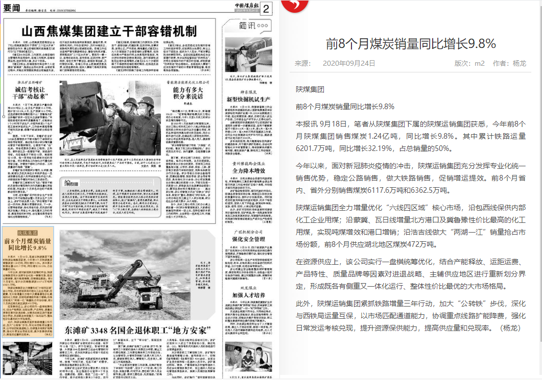 陕煤集团前8个月煤炭销量同比增长9.8%
