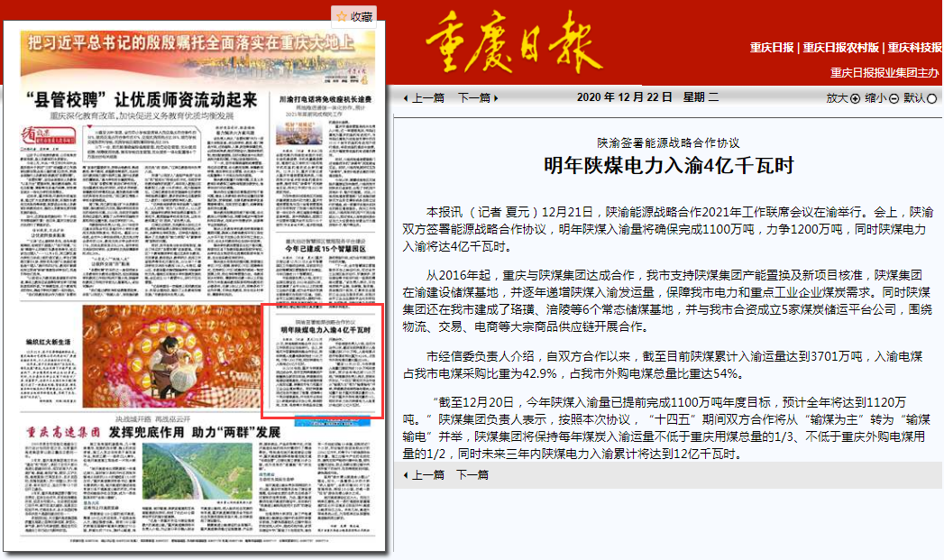 “截至12月20日,今年陕煤入渝量已提前完成1100万吨年度目标,预计全年将达到1120万吨。”陕煤集团负责人表示,按照本次协议,“十四五”期间双方合作将从“输煤为主”转为“输煤输电”并举,陕煤集团将保持每年煤炭入渝运量不低于重庆用煤总量的1/3、不低于重庆外购电煤用量的1/2,同时未来三年内陕煤电力入渝累计将达到12亿千瓦时。