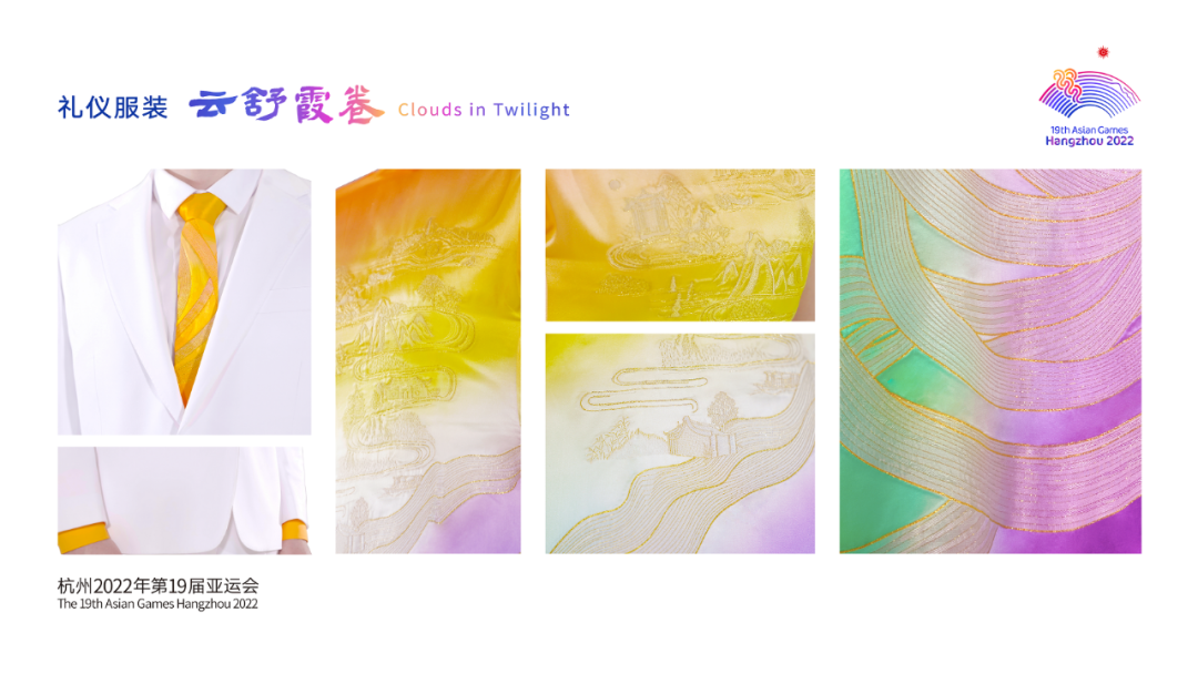 9月10日晚,在杭州奥体中心网球中心举行的杭州亚运会倒计时一周年活动上,杭州亚运会礼仪服装,杭州亚运会官方体育服饰正式发布。杭州亚运会礼仪服装设计主题为“云舒霞卷”,充满浓浓东方韵味。礼仪服装包括一套颁奖礼仪服(女装)、一套颁奖托盘员服(女装)和一套升旗手装(男装),由中国美术学院设计艺术学院教授吴海燕领衔设计完成。