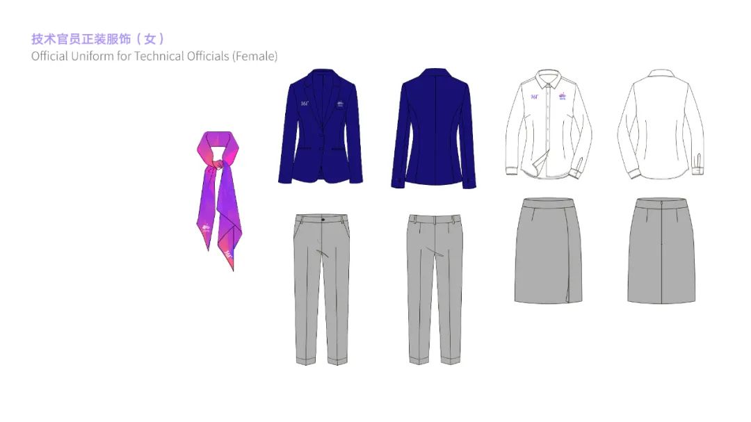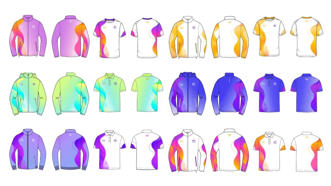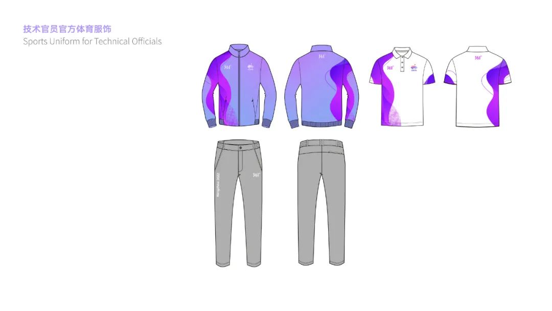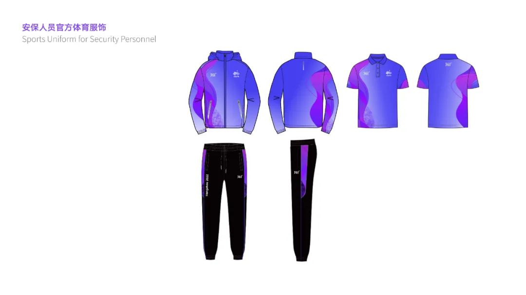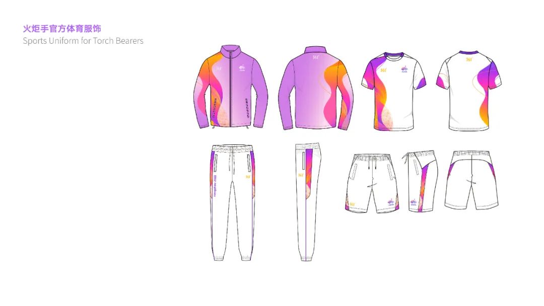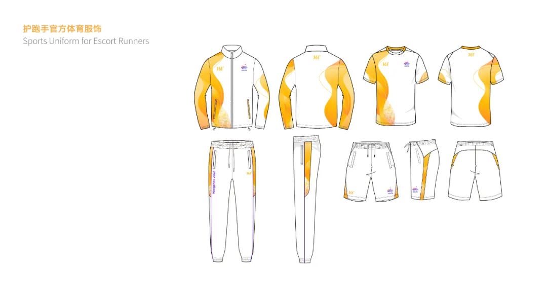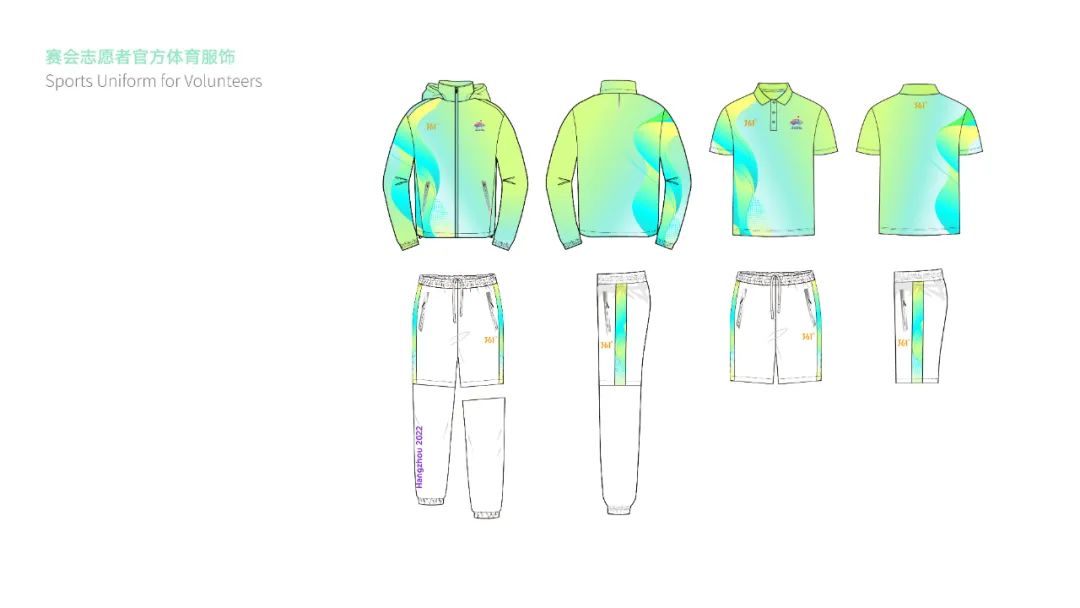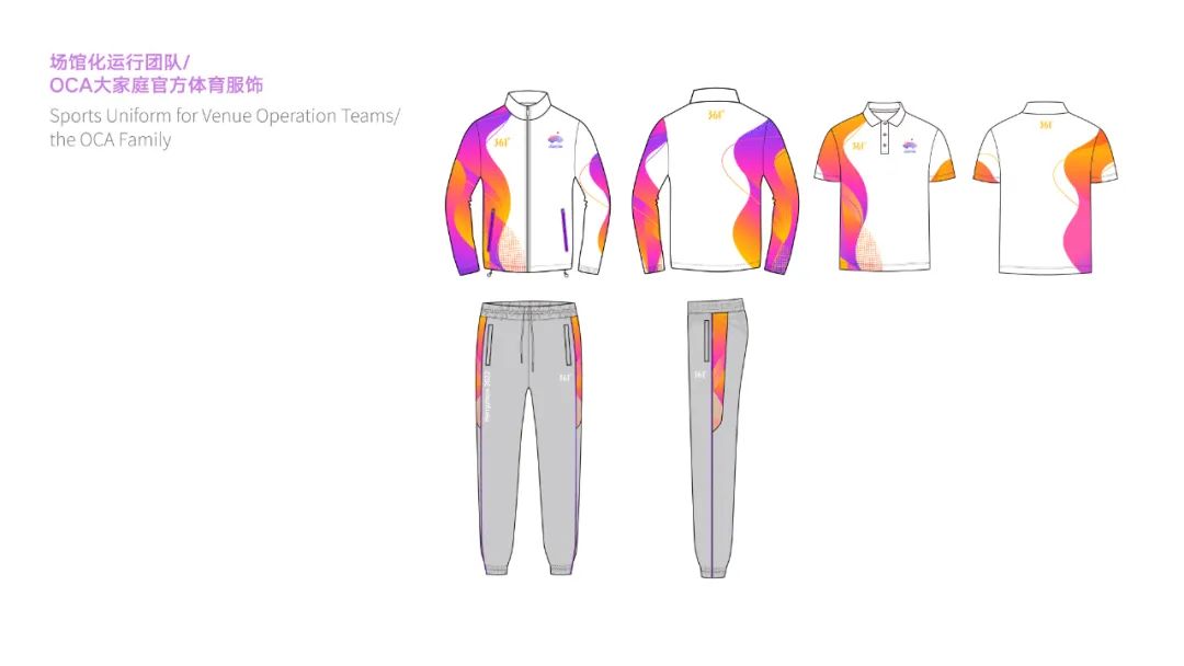杭州亚运会礼仪服装 杭州亚运会礼仪服装,包括颁奖礼仪服装与升旗手服装设计,是杭州亚运会重要视觉形象之一,也是体现杭州亚运精神、展示中国文化的重要载体。 杭州亚运会礼仪服装设计主题是“云舒霞卷”,寓意姿态万千,色彩斑斓。 颁奖礼仪服装色彩来源于亚运色彩“虹韵紫、月桂黄、水墨白、湖山绿”,月桂黄从上至下渐变,湖山绿、虹韵紫从左至右渐变,水墨白与其他颜色相互交融;设计元素来源于人文历史景观、钱塘奔腾潮涌、亚运竞技赛道,构建起华美丰富的图案;造型风格中西兼容,采用简单立领、宽阔肩部、收腰及斜摆裙的造型,其中托盘礼仪人员为短款,引导员为长款。 升旗手服装色彩来源于亚运色彩“月桂黄、水墨白”,上下皆白,配以橘黄、浅黄象征丰收景象渐变色的领带点缀;造型采用青年休闲西装款式。 杭州亚运会礼仪服装的设计由中国美术学院设计艺术学院教授吴海燕领衔设计完成。该礼仪服装将出现在杭州亚运会颁奖仪式上,在这一万众瞩目的焦点时刻,通过杭州亚运会礼仪着装向现场及屏幕前的各国观众展现出主办国和主办城市的民族文化、时代风貌及韵味风采。 杭州亚运会官方体育服饰 杭州亚运会官方体育服饰包括:火炬手官方体育服饰、护跑手官方体育服饰、赛会志愿者官方体育服饰、技术官员官方体育服饰、安保人员官方体育服饰、技术官员正装服饰、场馆化运行团队/OCA(亚奥理事会)大家庭官方体育服饰、OCA(亚奥理事会)大家庭正装服饰。 设计理念:发扬核心图形“润泽”的特性。 杭州亚运会官方体育服饰选用杭州亚运会核心图形变化丰富的右侧部分,整体呈现出灵动润泽的曲线美。中间融入充满时尚感、科技感的互联网云点状元素,融合传统与创新,交错呈现的点、线、面元素,给人以绵延的视觉美感和无穷的想象空间,象征着欢聚与交融、新生与活力,体现了超越共融的比赛景色。 色彩上,基于对中国色彩文化和杭州城市特质的提炼和浓缩,发挥“淡妆浓抹”色彩系统的独特魅力。从核心图形中吸取不同的色彩演绎各大客户群体,沉稳冷静、热情活力,兼容并蓄,共融于杭州亚运这个大舞台上。