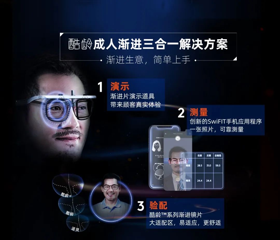酷龄渐进产品三合一整体解决方案由演示道具、SWIFIT手机APP数字测量及酷龄系列渐进镜片组成,三位一体提供了更真实的顾客体验、更简化的验配流程、更优化的渐进镜片性能,更强的容错和易适应性,甚至在存在一定程度的装配误差的情况下也能保持较好的镜片表现。