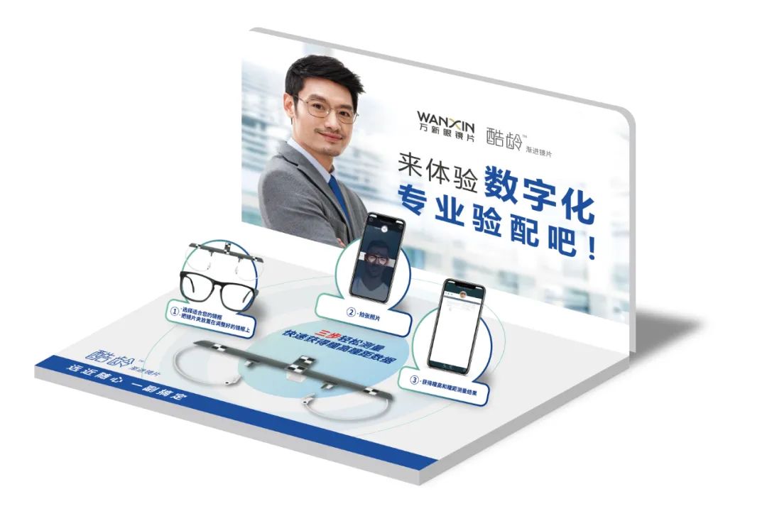 采用试戴架的造型,让消费者亲身体验佩戴渐进镜片的真实感受,轻松演示渐进镜片的好处,功能特点均可通过试戴专用演示道具呈现,以眼见为实的效果打消消费者的顾虑。