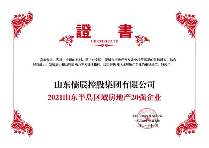 “2021山东半岛区域房地产20强企业”荣誉证书