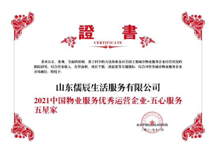 儒辰集团荣登“2021山东半岛区域房地产20强企业”位列第3位,旗下儒辰生活荣获“2021中国物业服务优秀运营企业”称号。