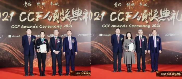 2021“CCF夏培肃奖”由北京大学金芝教授和清华大学史元春教授获得。CCF理事长梅宏教授、奖励委员会主席钱德沛教授和中科曙光副总裁杨福康先生为获奖者颁奖。