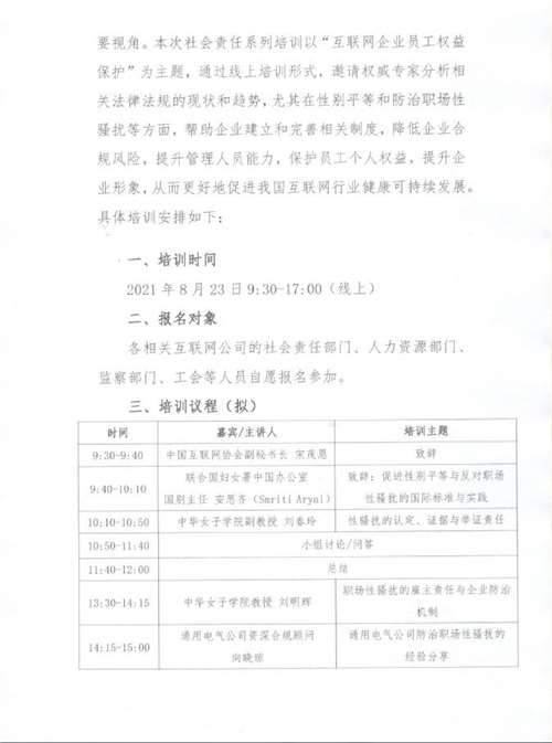 员工是企业可持续发展的基础,员工权益保护问题正逐步成为考量企业社会责任和可持续发展能力的一个重要视角。本次社会责任系列培训以“互联网企业员工权益保护”为主题,通过线上培训形式,邀请权威专家分析相关法律法规的现状和趋势,尤其在性别平等和防治职场性骚扰等方面,帮助企业建立和完善相关制度,降低企业合规风险,提升管理人员能力,保护员工个人权益,提升企业形象,从而更好地促进我国互联网行业健康可持续发展。具体培训安排如下: