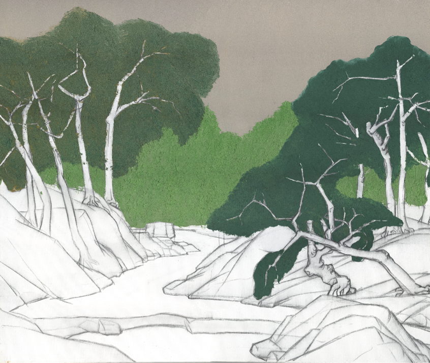 本次展览中还将首次公开肖谷老师为当年遗失的沈周版《东庄二十四景》中的三幅作品重新创作的新作。分别以完成状态、半色彩半素描状态、全素描手稿的形式展出。这种在传统山水画中“留白”的常用技法被运用在油画作品中,体现了艺术家对历史文化没有定论的审慎的态度,同时也让这场古今、中西的艺术对话更具有可读性。
