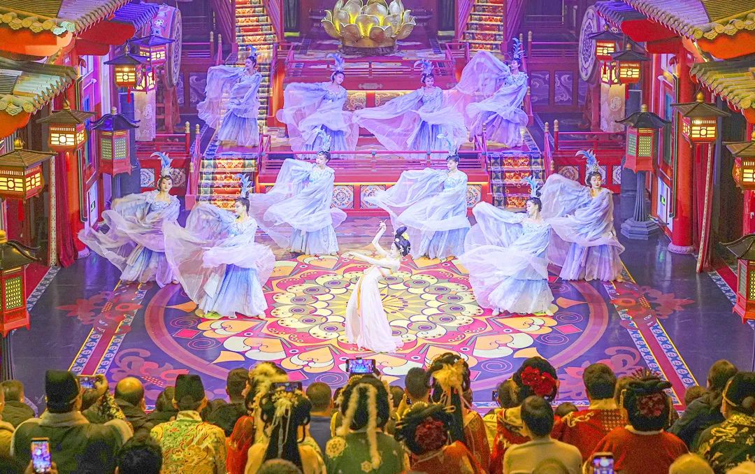 正在上元安康踏歌台上演的人气表演《霓裳羽衣舞》座无虚席,是必看表演之一。明光莹莹的莲花型舞台上,“杨贵妃”身姿婀娜、仙袂飘飘,一颦一笑尽显盛唐气象,轻柔灵动的舞姿仿佛带人走进仙境瑶池,穿越千年感受盛唐舞乐的浪漫。