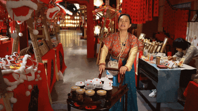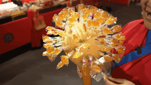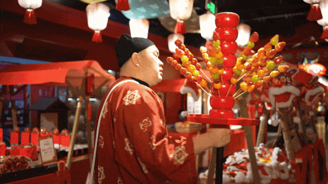热情叫卖的“葫芦哥”手中酸酸甜甜的糖葫芦让人无法拒绝!山楂、草莓、葡萄等新鲜水果裹上晶莹透亮的糖衣,现做现卖,不仅美味,也是格外好看的拍照道具哦~